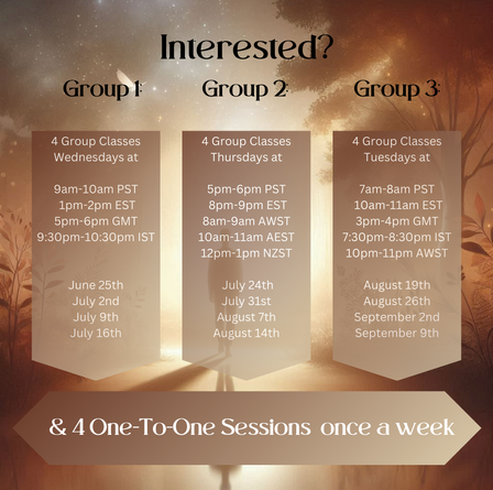 We meet as a group once a week for a workshop on Self Love, then you will have a private 1:1 Akashic Records session once a week with your practitioner to delve deeper into what you have learned.